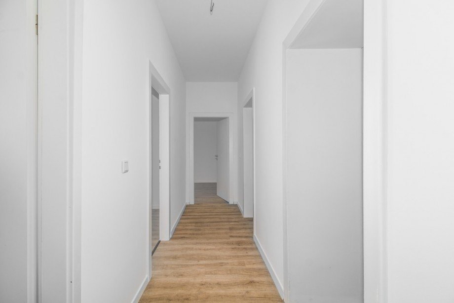 Die Wohnung hat einen klar strukturierten Grundriss: Ein zentraler, langer Flur erschließt alle Räume und sorgt für eine angenehme Trennung der Wohnbereiche.