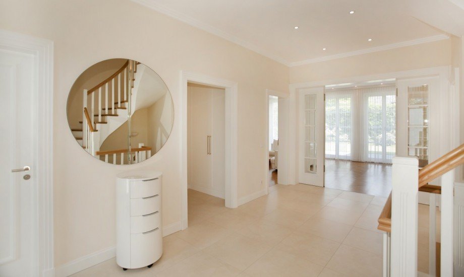 - großflächige, cremefarbene Keramikfliesen in Flur- und Sanitärbereichen